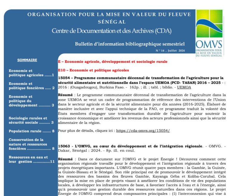– Le Portail officiel OMVSDOC – Bulletin d’information bibliographique du CDA, N°14