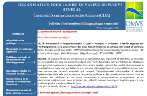 Chers lectrices et lecteurs, C’est avec un plaisir renouvelé que le Centre de Documentation et des Archives (CDA) de l’OMVS vous présente le 16ᵉ numéro de son Bulletin d’information bibliographique.